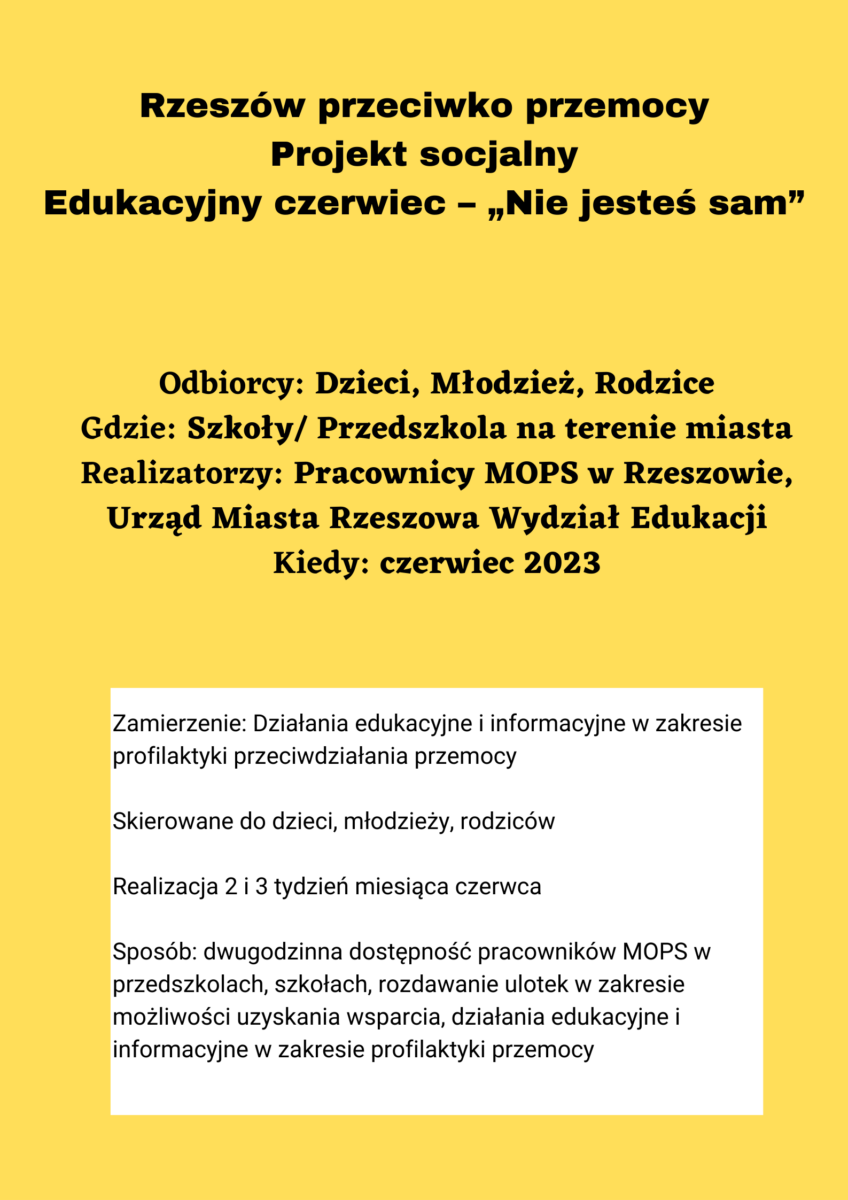 W ramach działań pracownicy MOPS-u będą pełnili dyżury w rzeszowskich szkołach i przedszkolach w celu realizacji działań informacyjno-edukacyjnych w zakresie przeciwdziałania przemocy i dostępności miejsc, gdzie można uzyskać wsparcie.