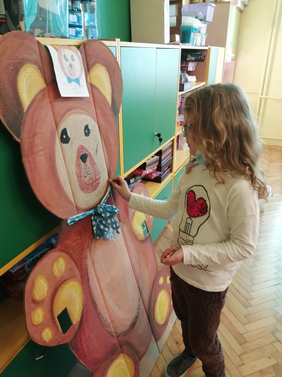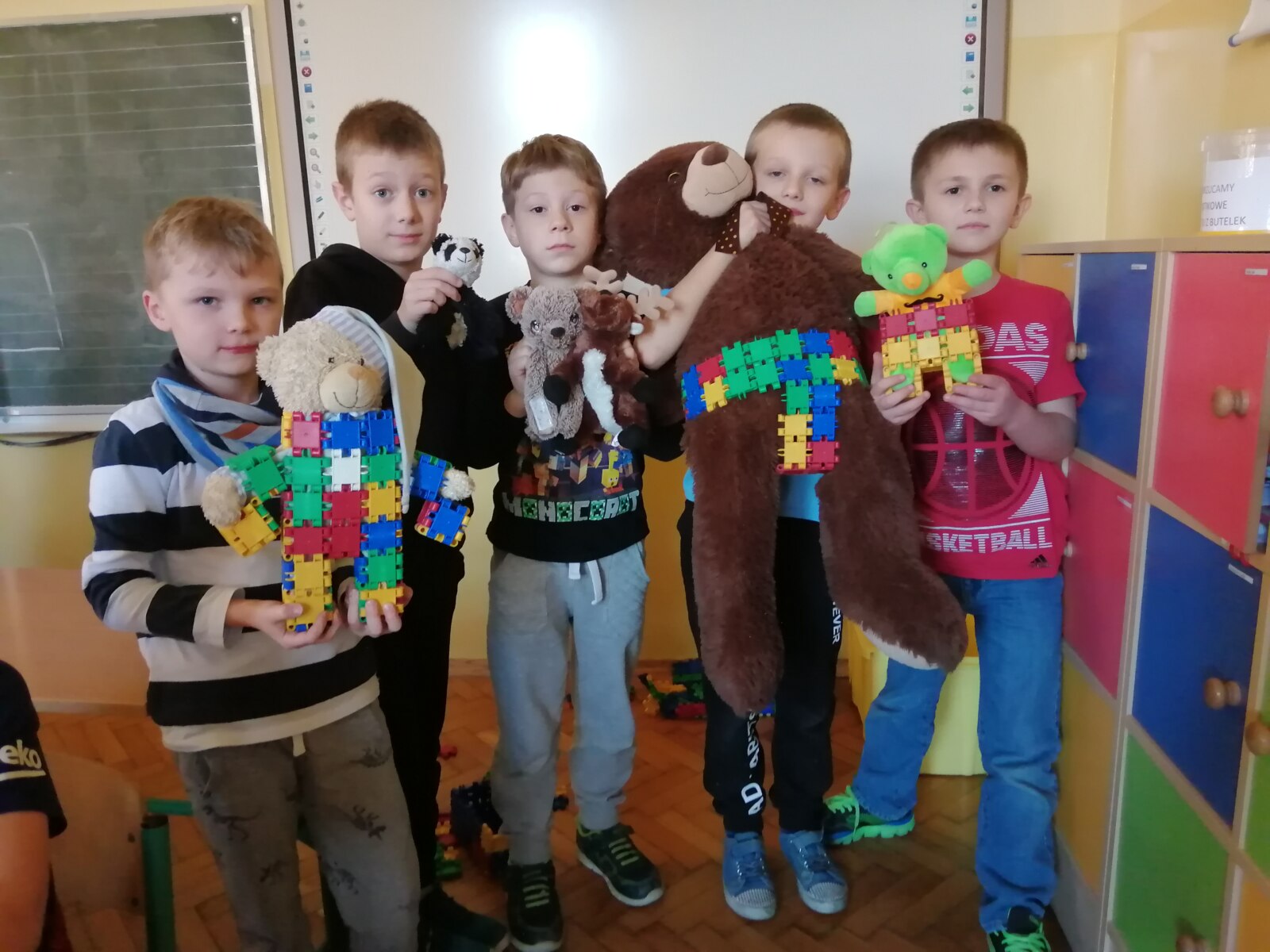 My w świetlicy stworzyliśmy naszego Misia, a jego pyszczek powstał w wyniku konkursu rysunkowego, który wygrała uczennica klasy 1b Helena Żarów. Pyszczek Misia wg projektu Helenki podobał się najbardziej i zebrał najwięcej głosów. W nagrodę uczennica własnoręcznie pastelami narysowała go Misiowi. Chłopcy z klasy 2a zabawili się w kreatorów ubrań z klocków dla misiów i wyszło im to całkiem dobrze.